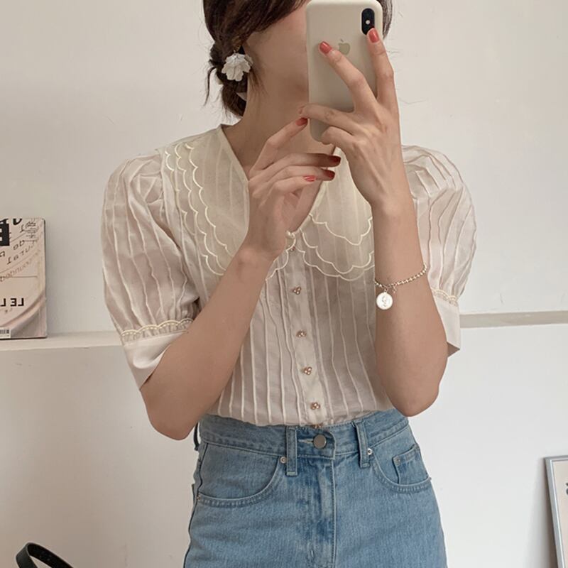 新品 スリムボタンプリーツショートスリーブシャツブラウストップス ⦿韓国 オルチャン K-pop アイドル ジャケット スーツ ワンピース カーディガン ニット フーディー トレーナー キャミソール スカート シャツ ブラウス 5A2632828