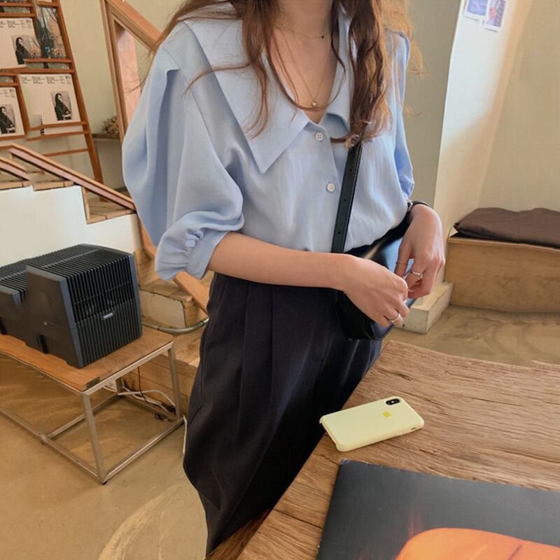 新品 ブルーシャツブラウスカジュアル大人女子☆ ⦿韓国 オルチャン K-pop アイドル ジャケット スーツ ワンピース カーディガン ニット フーディー トレーナー キャミソール スカート シャツ ブラウス 5A2745190