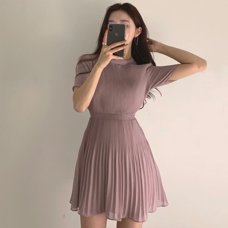 新品 ラウンドネックソリッド カラー★スリムAラインシフォンプリーツスカート ソリッドカラー ⦿韓国 オルチャン K-pop アイドル ジャケット スーツ ワンピース カーディガン ニット フーディー トレーナー キャミソール スカート シャツ ブラウス 5A1307415