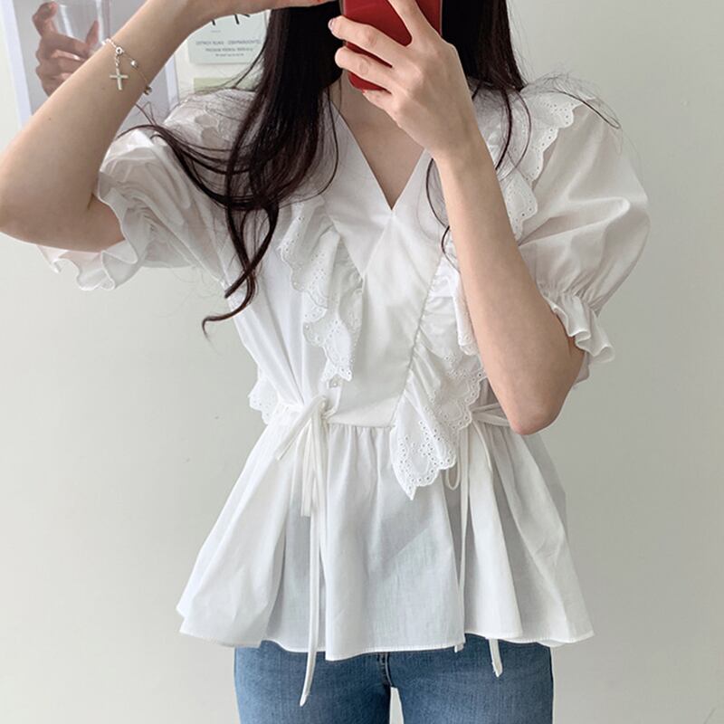 新品 ♡Vネック♥カワイイ♥レースサイド★スリーブシャツブラウストップス ステッチ ⦿韓国 オルチャン K-pop アイドル ジャケット スーツ ワンピース カーディガン ニット フーディー トレーナー キャミソール スカート シャツ ブラウス 5A6667043