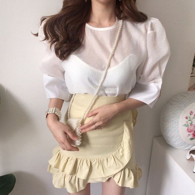 新品 ストライプラウンドネックスリーブシャツブラウス今年流行☆ラッフルスカート ⦿韓国 オルチャン K-pop アイドル ジャケット スーツ ワンピース カーディガン ニット フーディー トレーナー キャミソール スカート シャツ ブラウス 5A2294226