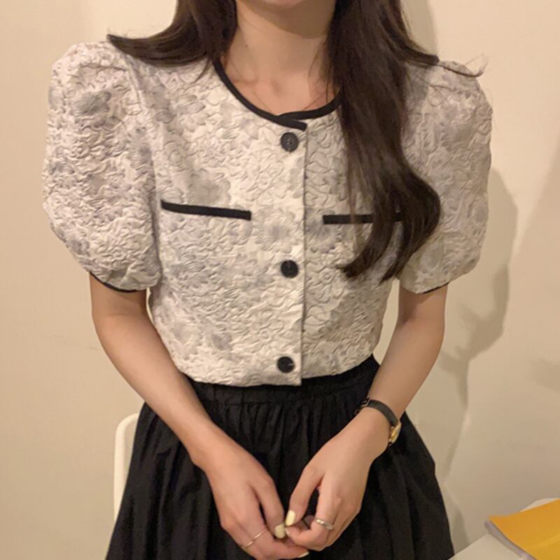 新品 清楚系ラウンドネックカラージャカードスリーブショートシャツブラウス 大人女子☆ レトロ ⦿韓国 オルチャン K-pop アイドル ジャケット スーツ ワンピース カーディガン ニット フーディー トレーナー キャミソール スカート シャツ ブラウス 5A7232128