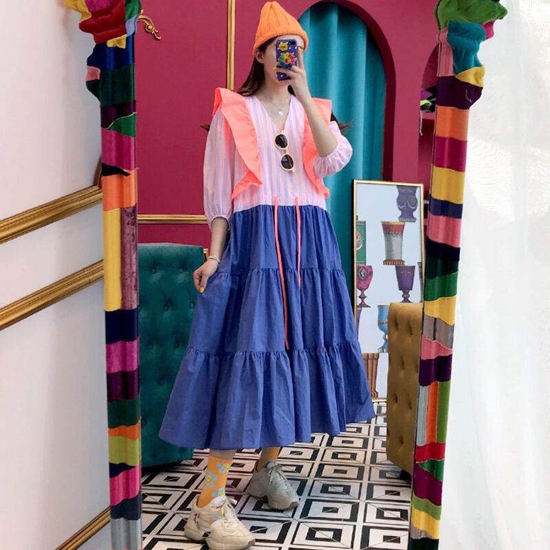 新品 ♡Vネックカラーストライプラッフルギャザーロングスカート ステッチ ⦿韓国 オルチャン K-pop アイドル ジャケット スーツ ワンピース カーディガン ニット フーディー トレーナー キャミソール スカート シャツ ブラウス 5A2577666 | K clothig adult