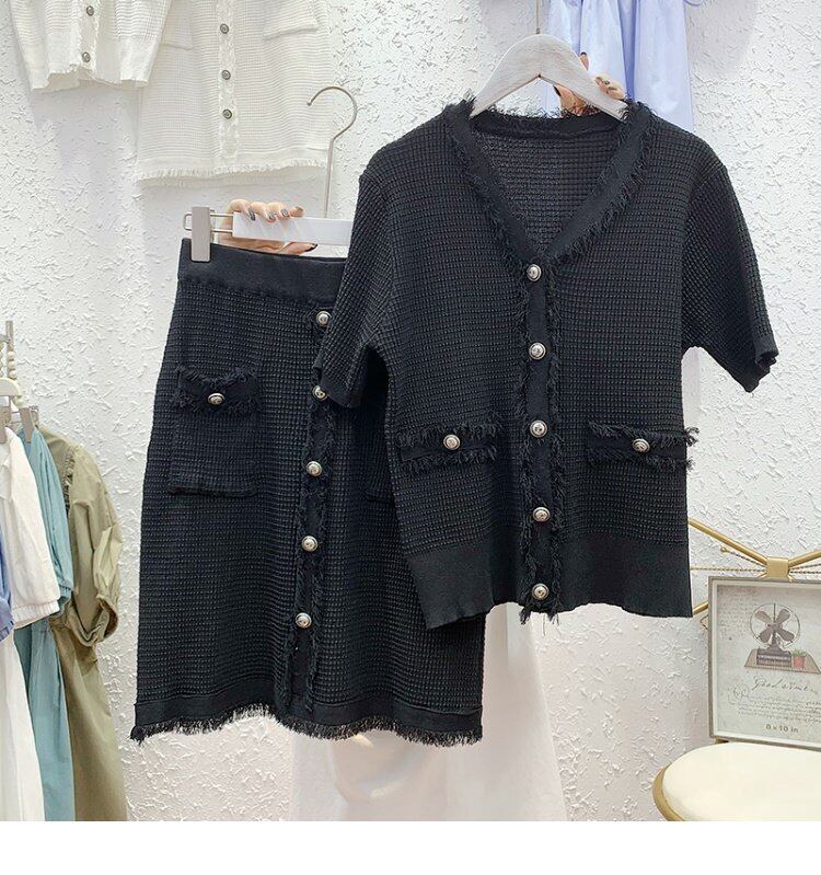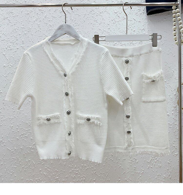 新品 Vネックニットカーディガンスカート ブラック白セット サマー ホワイト 夏物 ⦿韓国 オルチャン K-pop アイドル ジャケット スーツ ワンピース カーディガン ニット フーディー トレーナー キャミソール スカート シャツ ブラウス 5B0430452