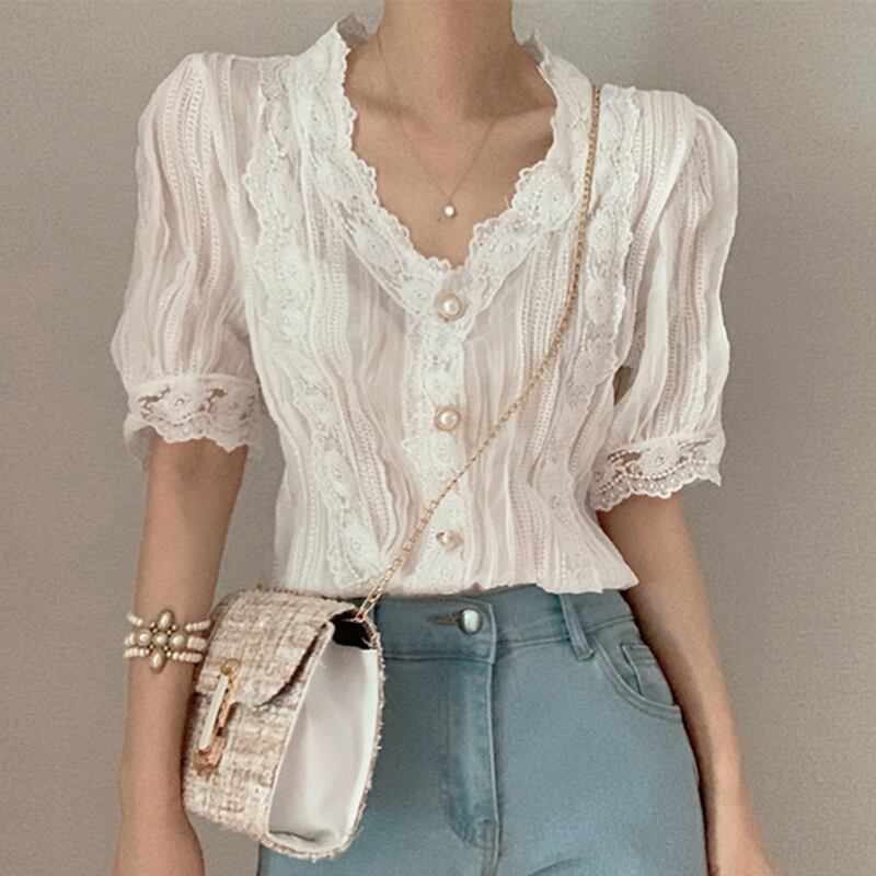 新品 ♥カワイイ♥Vネックパールバックルレースシャツブラウス 真珠 ステッチ ⦿韓国 オルチャン K-pop アイドル ジャケット スーツ ワンピース カーディガン ニット フーディー トレーナー キャミソール スカート シャツ ブラウス 5A8884524
