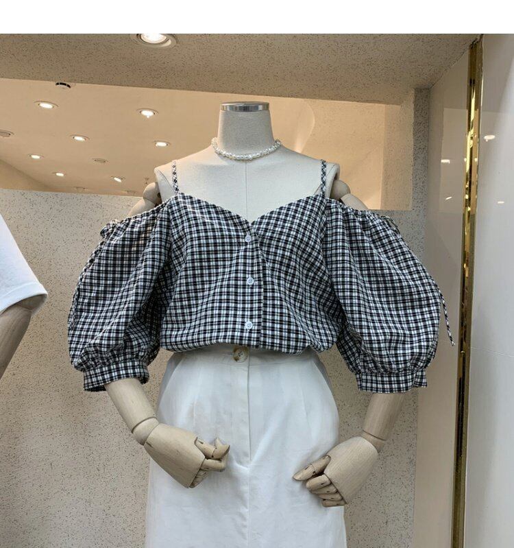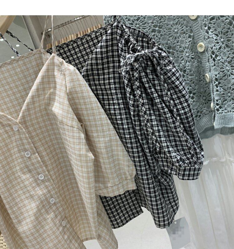 新品 サマーチェック柄ストラップレススリーブシャツブラウス スウィート 夏物 ⦿韓国 オルチャン K-pop アイドル ジャケット スーツ ワンピース カーディガン ニット フーディー トレーナー キャミソール スカート シャツ ブラウス 5B1593134