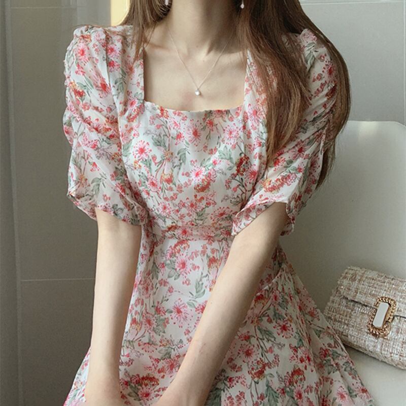 新品 ♡花柄★スリムシフォンワンピースドレスOP 大人女子☆スクウェアネック ⦿韓国 オルチャン K-pop アイドル ジャケット スーツ ワンピース カーディガン ニット フーディー トレーナー キャミソール スカート シャツ ブラウス 5A1595456