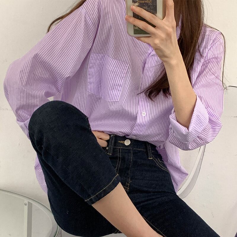 新品 スタンダードストライプシャツブラウスカジュアル大人女子☆ ロング レトロ ⦿韓国 オルチャン K-pop アイドル ジャケット スーツ ワンピース カーディガン ニット フーディー トレーナー キャミソール スカート シャツ ブラウス 5A6161308