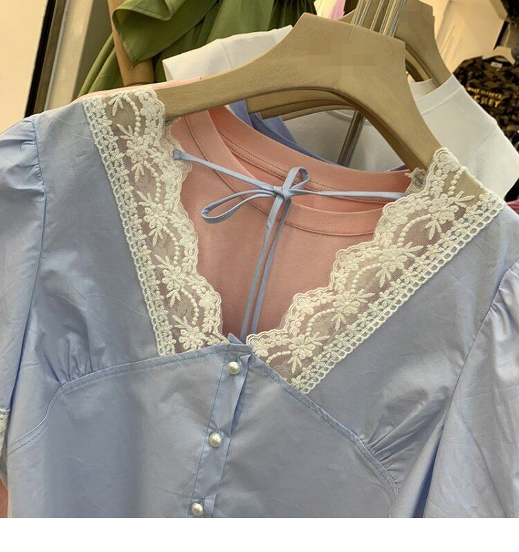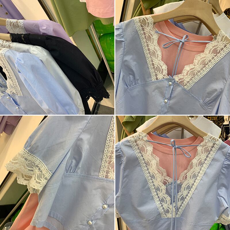新品 レーススリーブショートカジュアルシャツブラウス スウィート ステッチ ⦿韓国 オルチャン K-pop アイドル ジャケット スーツ ワンピース カーディガン ニット フーディー トレーナー キャミソール スカート シャツ ブラウス 5B7584457