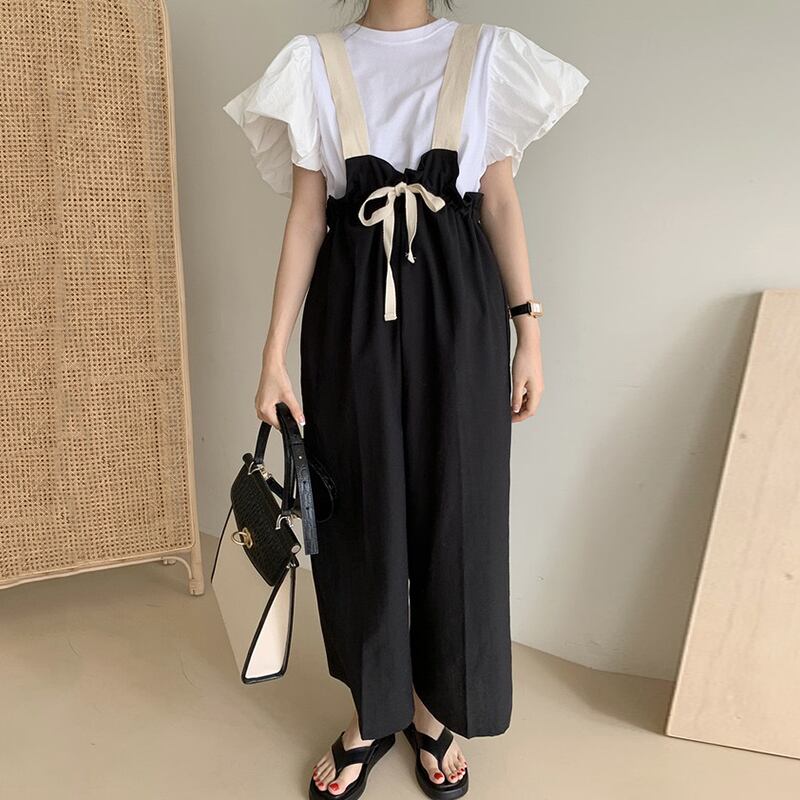 色:パフスリーブトップ,紫のオーバーオール,黒いオーバーオール