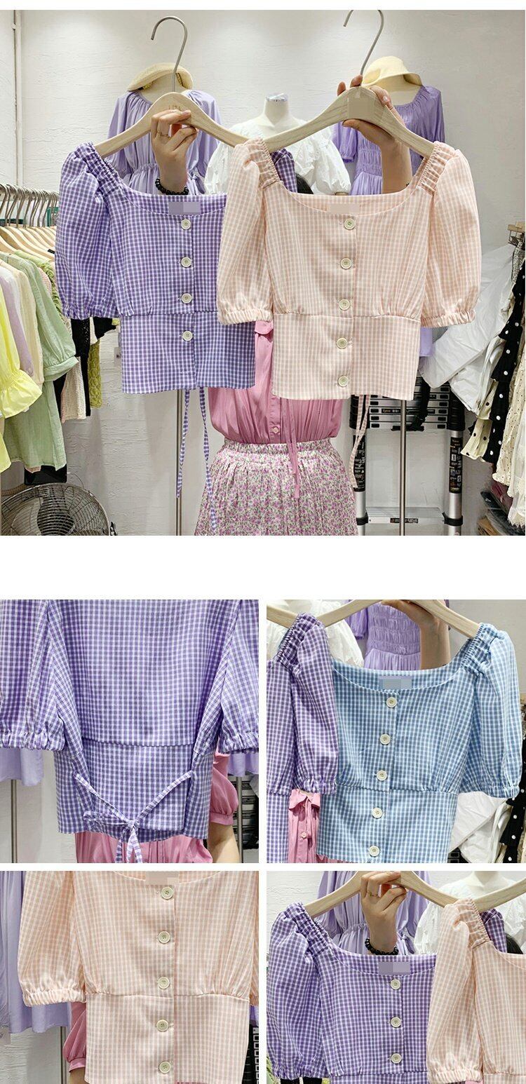 新品 スリーブチェック柄シャツブラウススリム スクウェア ⦿韓国 オルチャン K-pop アイドル ジャケット スーツ ワンピース カーディガン ニット フーディー トレーナー キャミソール スカート シャツ ブラウス 5B0720893