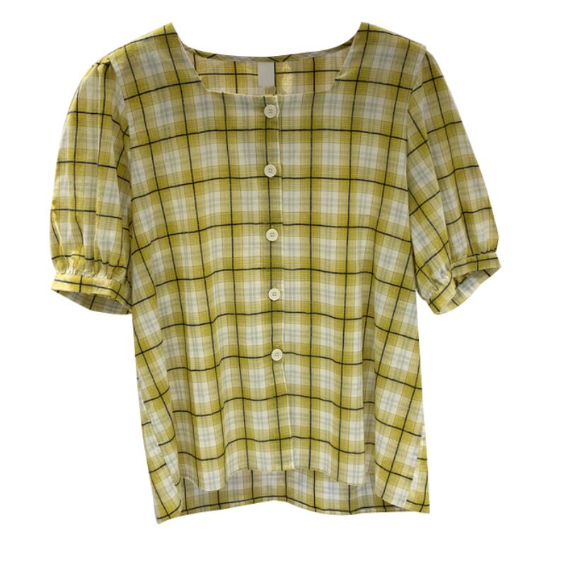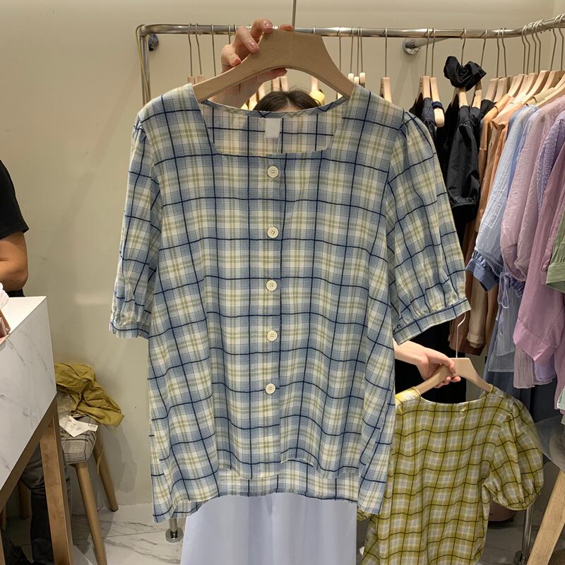 新品 サマーチェック柄シングルブレストスリーブシャツブラウス大人女子☆ コットン 夏物 スクウェア ⦿韓国 オルチャン K-pop アイドル ジャケット スーツ ワンピース カーディガン ニット フーディー トレーナー キャミソール スカート シャツ ブラウス 5B4244113