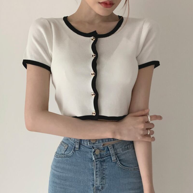 新品 ♡ラウンドネックカラーボタンスリムショートクロップドニットトップス 大人女子☆ ⦿韓国 オルチャン K-pop アイドル ジャケット スーツ ワンピース カーディガン ニット フーディー トレーナー キャミソール スカート シャツ ブラウス 5A7195587