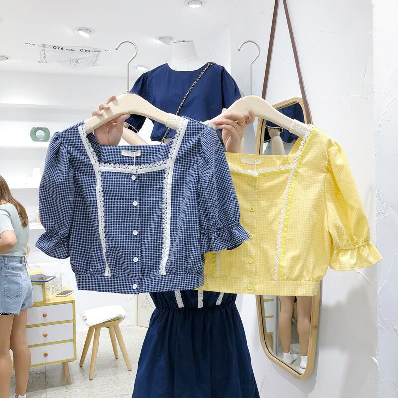 新品 ♡カラーチェック柄♥カワイイ♥スリーブレースショートトップス ピュア ⦿韓国 オルチャン K-pop アイドル ジャケット スーツ ワンピース カーディガン ニット フーディー トレーナー キャミソール スカート シャツ ブラウス 5B5063457