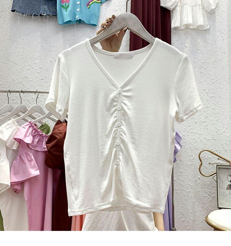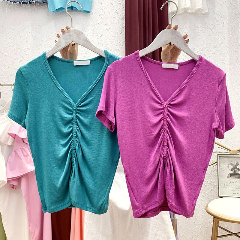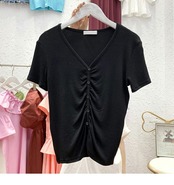 新品 Tシャツ ブレストプリーツリブVネックトップス ショートスキニー コットン エラスティック 伸縮 ⦿韓国 オルチャン K-pop アイドル ジャケット スーツ ワンピース カーディガン ニット フーディー トレーナー キャミソール スカート シャツ ブラウス 5B8016588