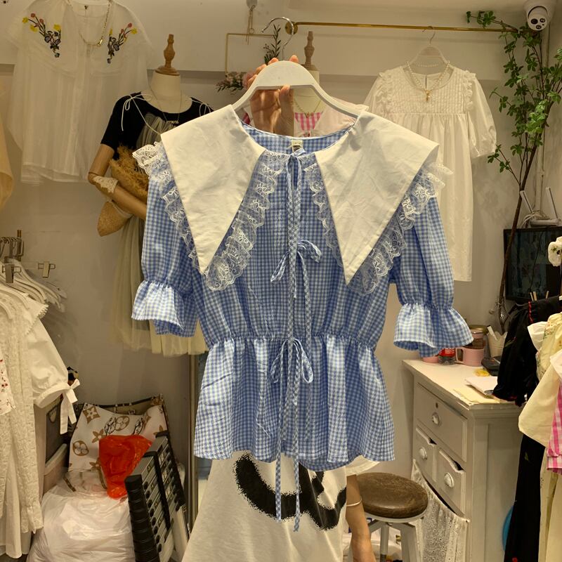 新品 レースチェック柄トップス 大人女子☆ ステッチ ⦿韓国 オルチャン K-pop アイドル ジャケット スーツ ワンピース カーディガン ニット フーディー トレーナー キャミソール スカート シャツ ブラウス 5B5639231 | K clothig adult