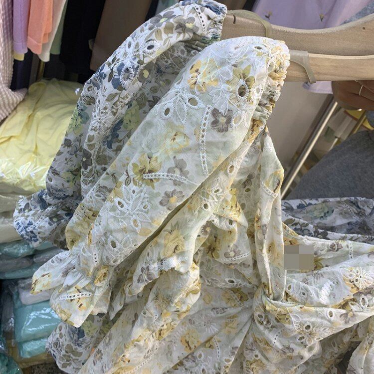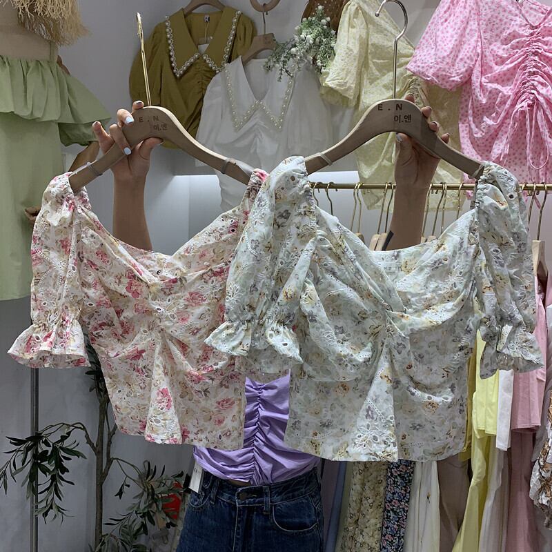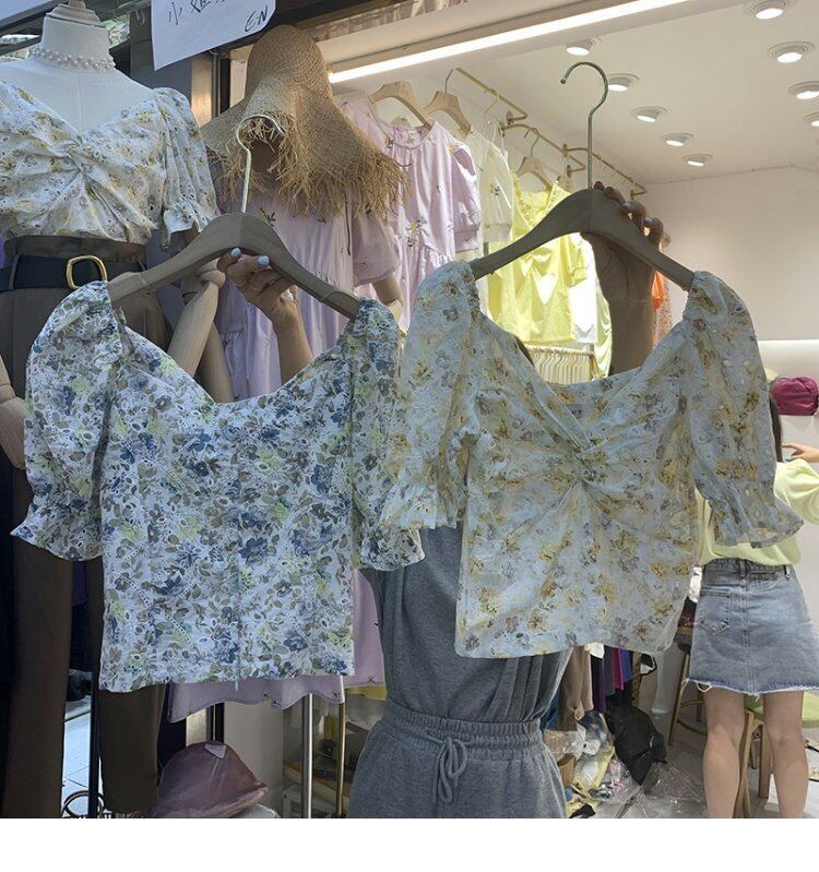 新品 Vネックスリーブショートシャツブラウスプルオーバー 花柄トップス コットン スウィート ⦿韓国 オルチャン K-pop アイドル ジャケット スーツ ワンピース カーディガン ニット フーディー トレーナー キャミソール スカート シャツ ブラウス 5B9905030