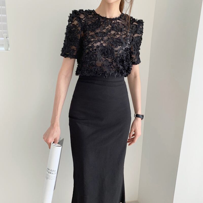 新品 ♡ラウンドネックレースTシャツ 今年流行☆スカート ⦿韓国 オルチャン K-pop アイドル ジャケット スーツ ワンピース カーディガン ニット フーディー トレーナー キャミソール スカート シャツ ブラウス 5A4828708