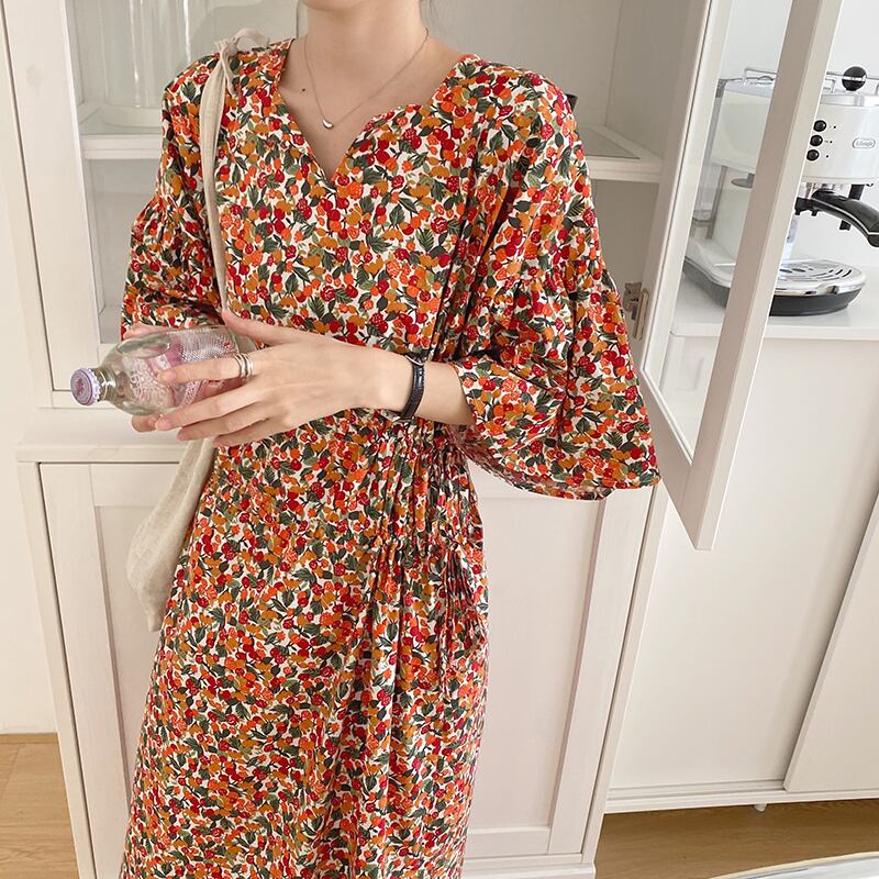 新品 花柄Vネック♥カワイイ♥サイドギャザースリーブロングスカート スウィート ⦿韓国 オルチャン K-pop アイドル ジャケット スーツ ワンピース カーディガン ニット フーディー トレーナー キャミソール スカート シャツ ブラウス 5A5569449