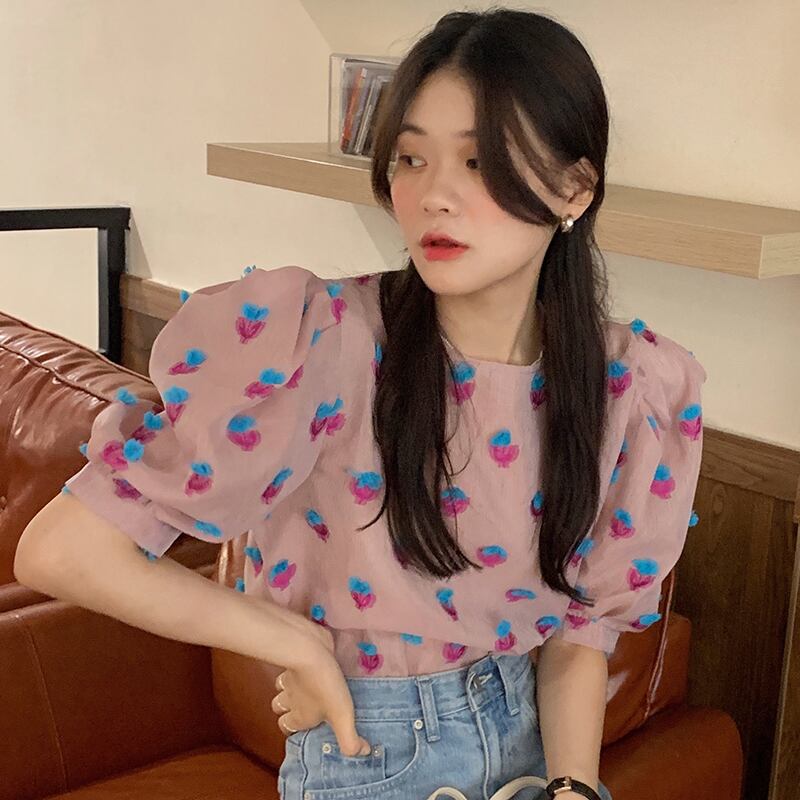 新品 スタンダードラウンドネック刺繍花柄スリーブシャツブラウス レトロ スウィート フラワーデザイン ⦿韓国 オルチャン K-pop アイドル ジャケット スーツ ワンピース カーディガン ニット フーディー トレーナー キャミソール スカート シャツ ブラウス 5A6037132 | K clothig adult