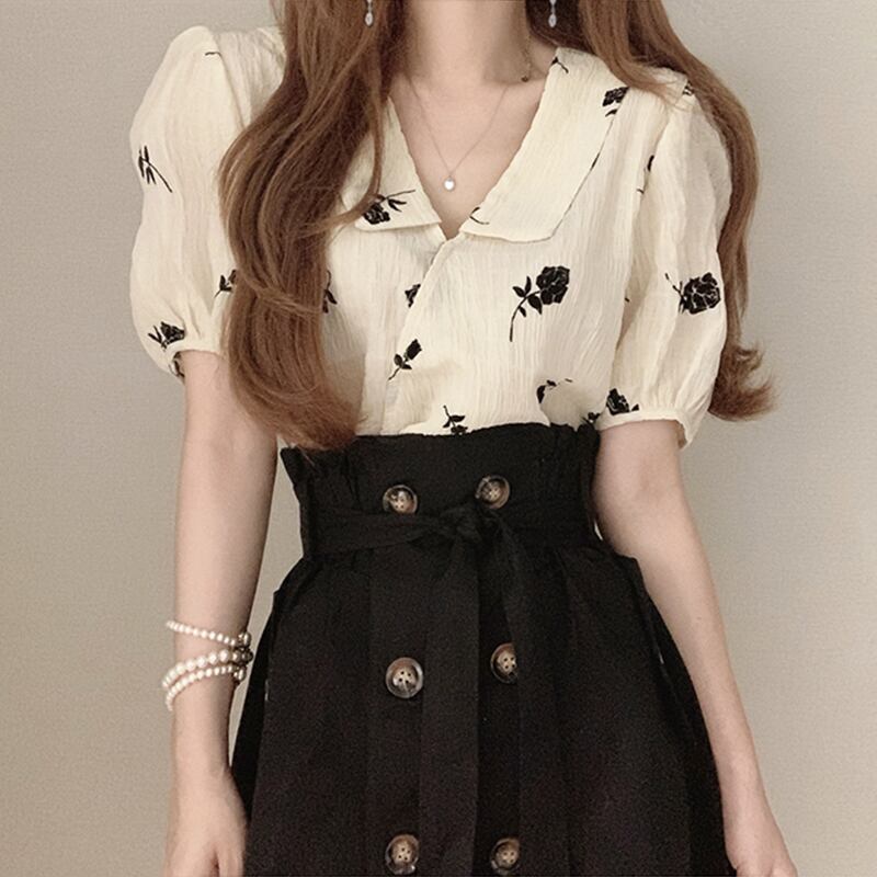 新品 スタンダードスリーブ花柄シャツブラウスダブルブレストスカート レトロ フラワーデザイン ⦿韓国 オルチャン K-pop アイドル ジャケット スーツ ワンピース カーディガン ニット フーディー トレーナー キャミソール スカート シャツ ブラウス 5A1517169