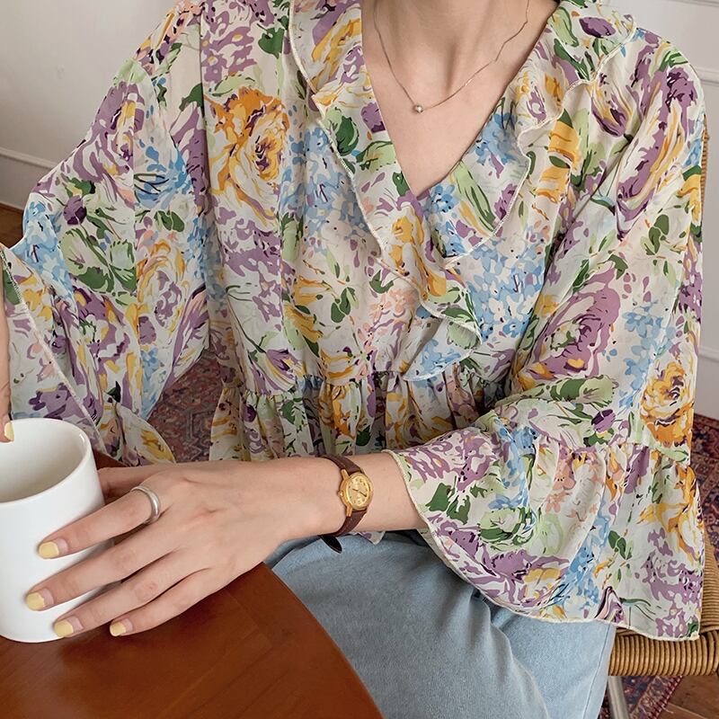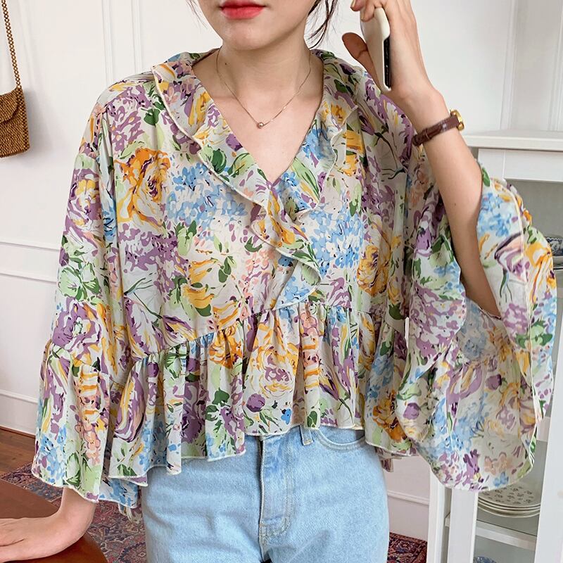 新品 花柄Vネックラッフルスリーブシャツブラウス大人女子☆ ステッチ ⦿韓国 オルチャン K-pop アイドル ジャケット スーツ ワンピース カーディガン ニット フーディー トレーナー キャミソール スカート シャツ ブラウス 5A0674732