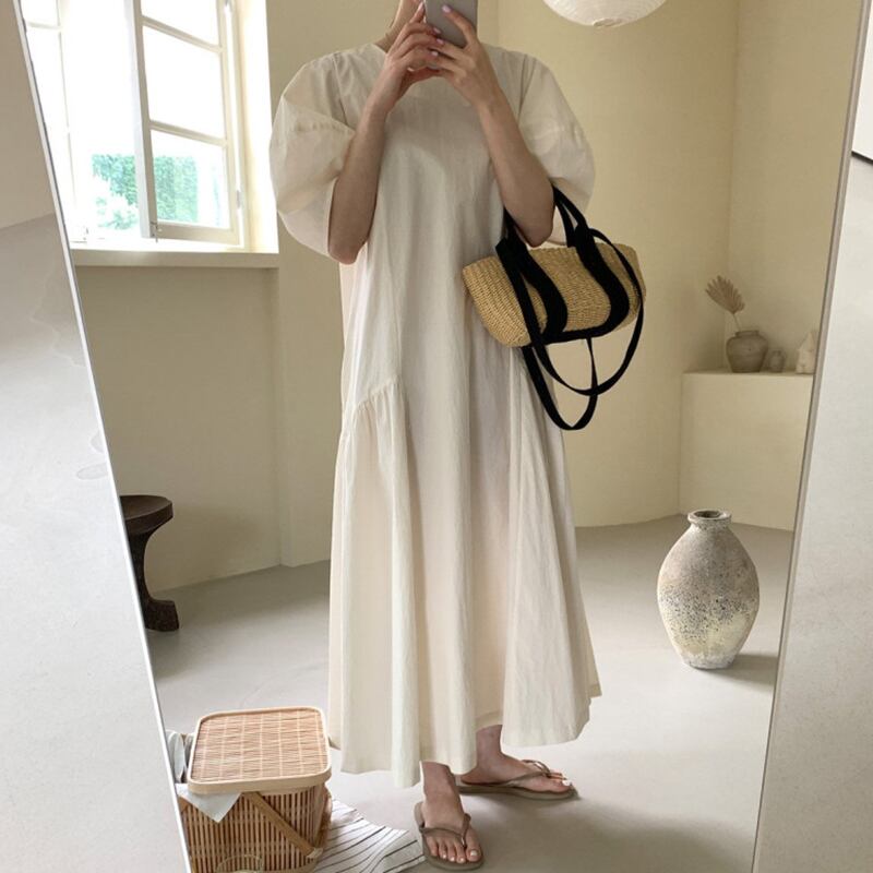新品 シフォンラウンドネックパフスリーブワンピースドレスOP ロングスカート ランタンスリーブ ⦿韓国 オルチャン K-pop アイドル ジャケット スーツ ワンピース カーディガン ニット フーディー トレーナー キャミソール スカート シャツ ブラウス 5A1431258