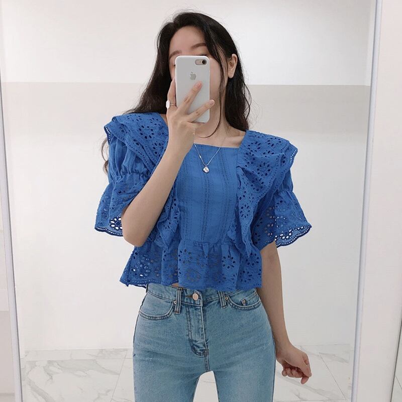新品 ♡レースショートスリーブシャツブラウス大人女子☆ スクウェア ⦿韓国 オルチャン K-pop アイドル ジャケット スーツ ワンピース カーディガン ニット フーディー トレーナー キャミソール スカート シャツ ブラウス 5A3456797