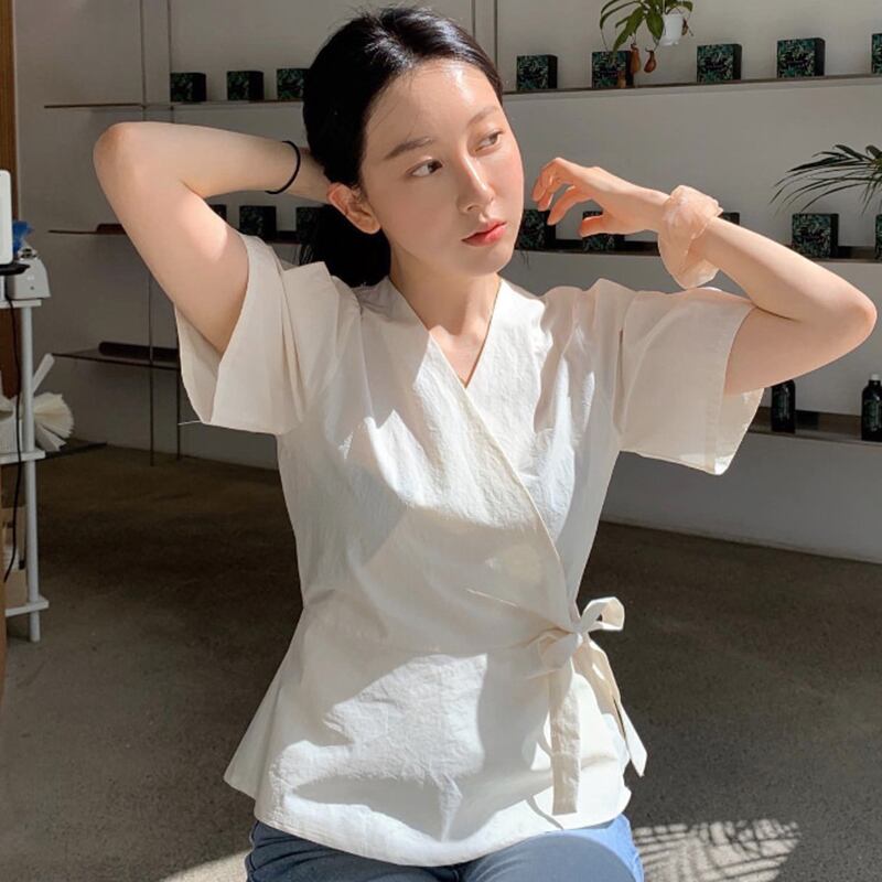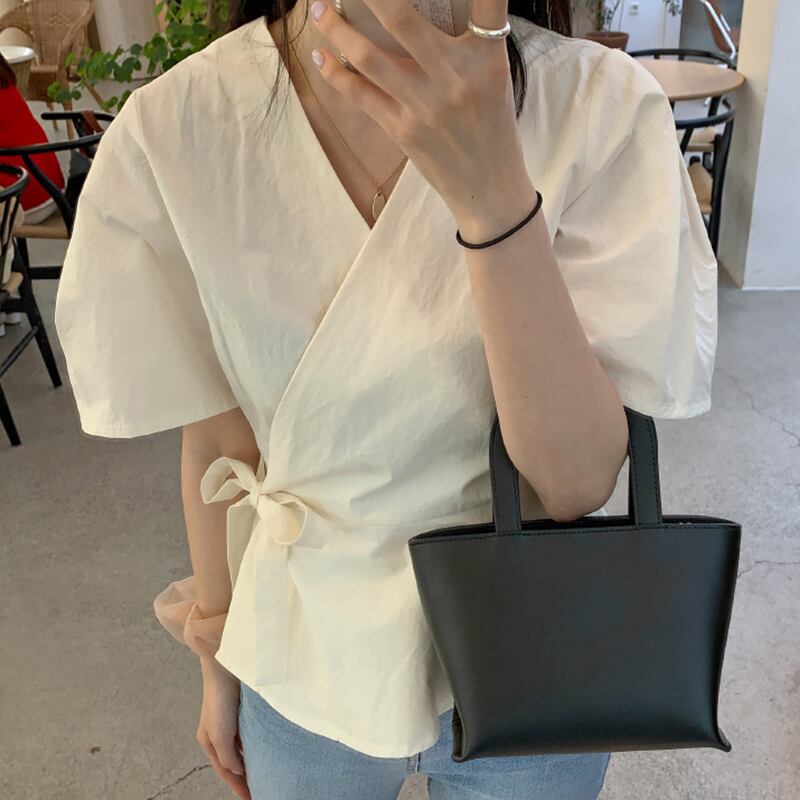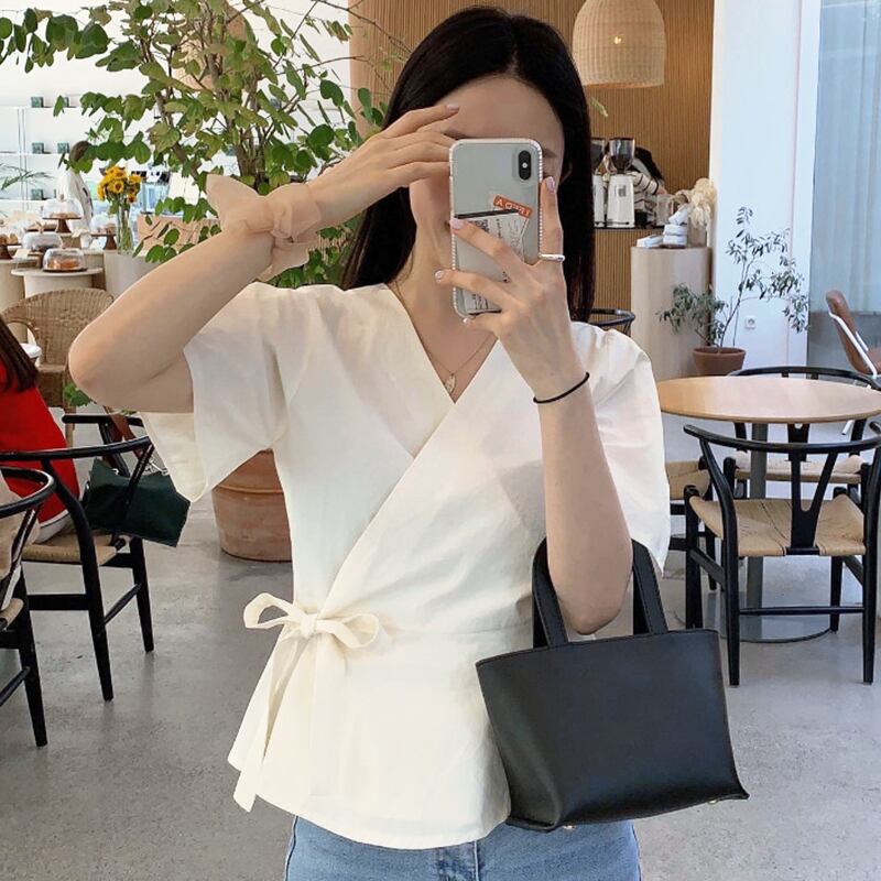 新品 Vネック♥カワイイ♥サイドストラップ ワンピーススリーブシャツブラウストップス ⦿韓国 オルチャン K-pop アイドル ジャケット スーツ ワンピース カーディガン ニット フーディー トレーナー キャミソール スカート シャツ ブラウス 5A1031987