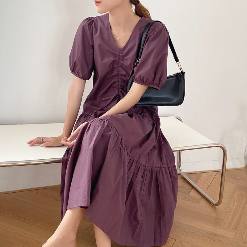 新品 Vネックギャザースリーブロングスカート エレガント パープル ⦿韓国 オルチャン K-pop アイドル ジャケット スーツ ワンピース カーディガン ニット フーディー トレーナー キャミソール スカート シャツ ブラウス 5A5811933 | K clothig adult