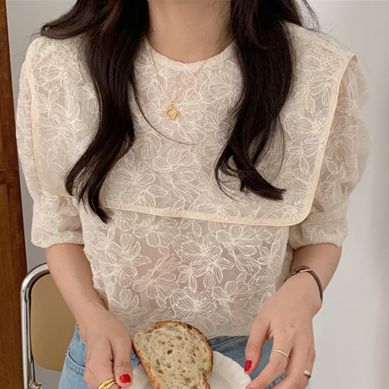 新品 ネイビー刺繍レーススリーブシャツブラウス ⦿韓国 オルチャン K-pop アイドル ジャケット スーツ ワンピース カーディガン ニット フーディー トレーナー キャミソール スカート シャツ ブラウス 5A3770309 | K clothig adult