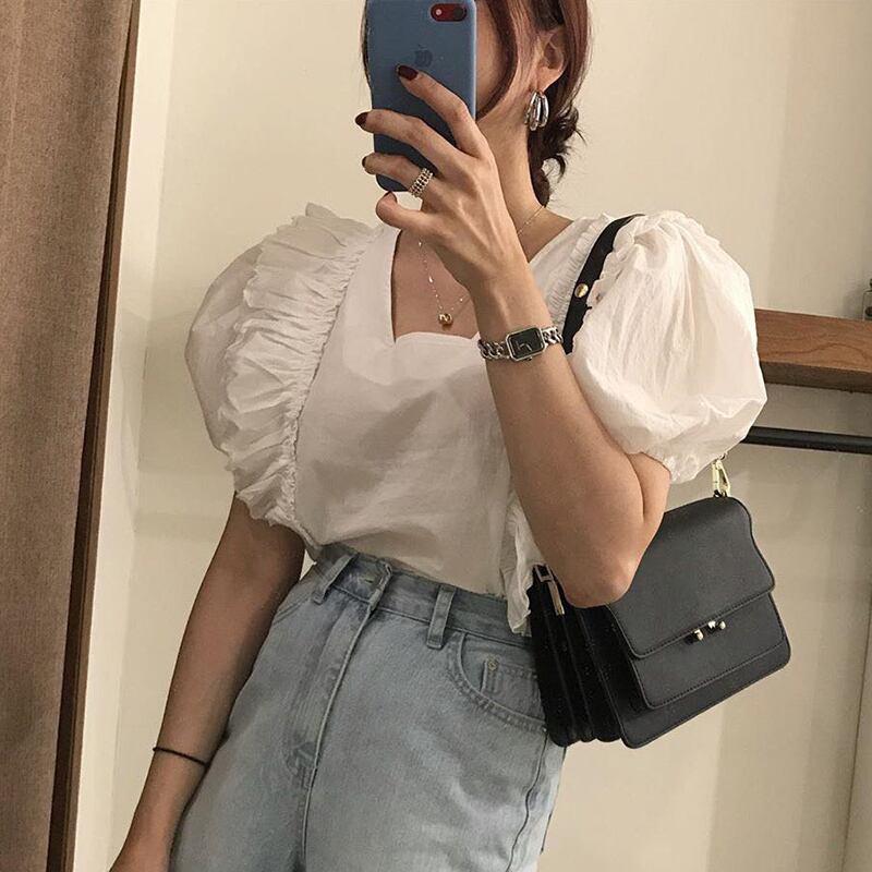 新品 ♡♥カワイイ♥プリーツソリッド カラースリーブシャツブラウス ソリッドカラー スクウェア ステッチ ⦿韓国 オルチャン K-pop アイドル ジャケット スーツ ワンピース カーディガン ニット フーディー トレーナー キャミソール スカート シャツ ブラウス 5A5917843
