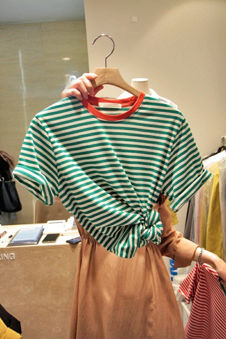 新品 ラウンドネックストライプTシャツ 半袖スリーブトップス ショート ⦿韓国 オルチャン K-pop アイドル ジャケット スーツ ワンピース カーディガン ニット フーディー トレーナー キャミソール スカート シャツ ブラウス 5B9367989 | K clothig adult