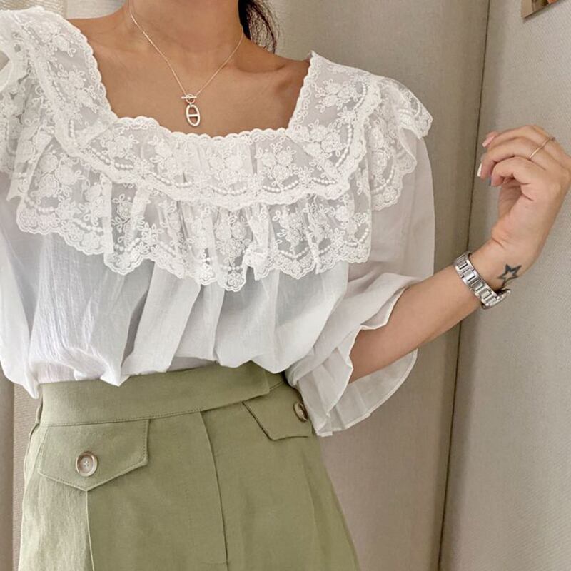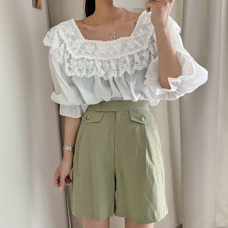 新品 ダブルレースサイドシャツブラウスカジュアルパンツ ショートパンツ大人女子☆ スクウェア ⦿韓国 オルチャン K-pop アイドル ジャケット スーツ ワンピース カーディガン ニット フーディー トレーナー キャミソール スカート シャツ ブラウス 5A2307201