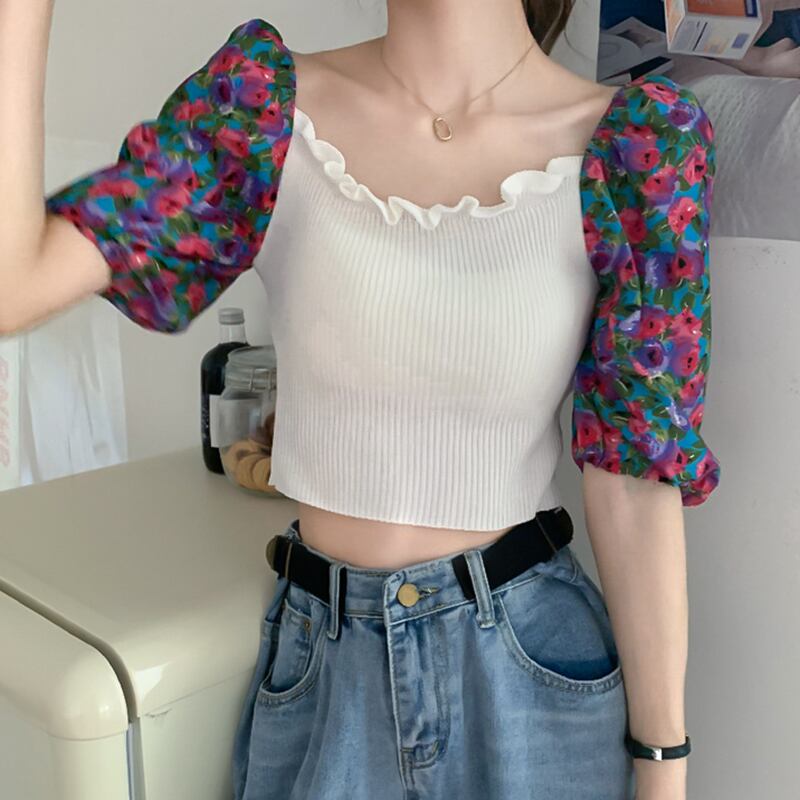 新品 ♥カワイイ♥花柄スリーブスリムショートセーター 大人女子☆ スクウェア ステッチ ⦿韓国 オルチャン K-pop アイドル ジャケット スーツ ワンピース カーディガン ニット フーディー トレーナー キャミソール スカート シャツ ブラウス 5A2386798