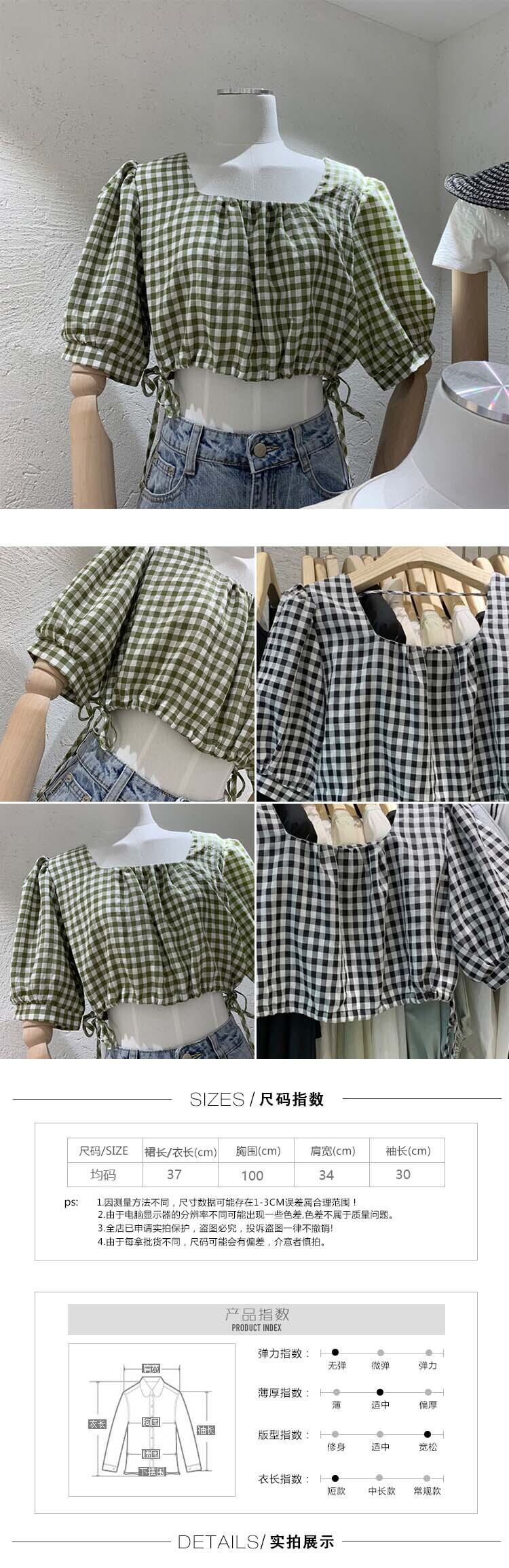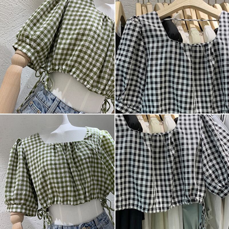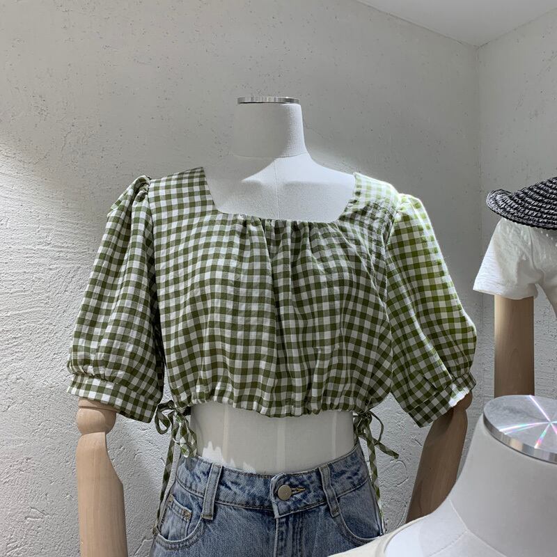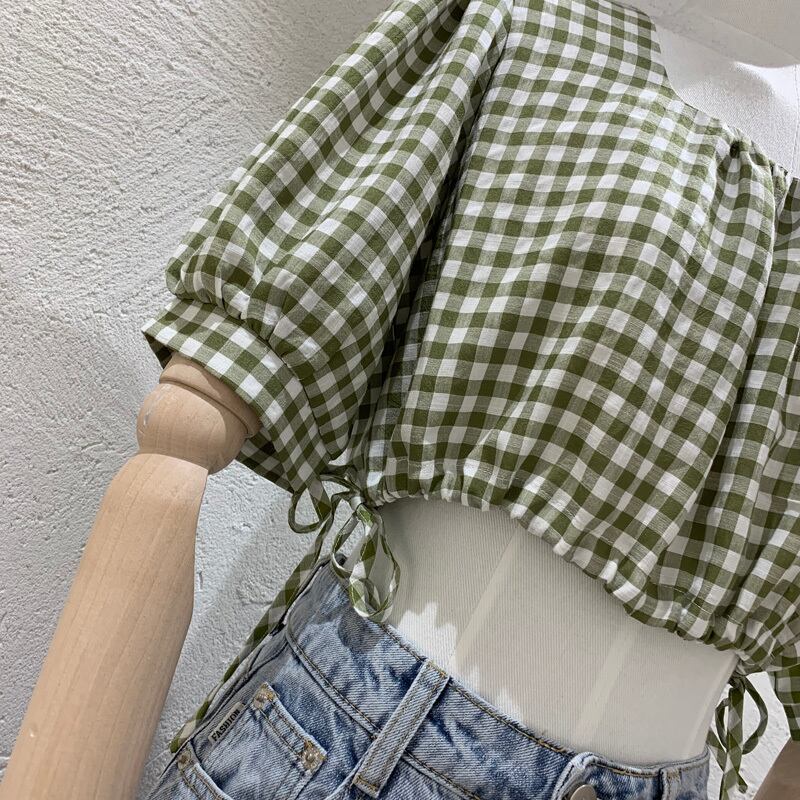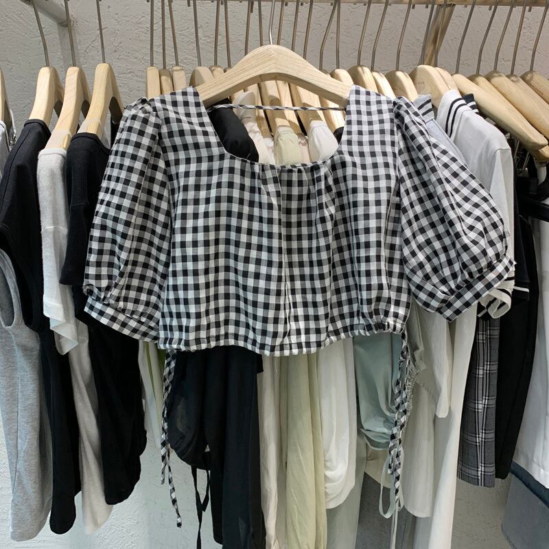 新品 チェック柄スリーブショートギャザートップス スクウェア ⦿韓国 オルチャン K-pop アイドル ジャケット スーツ ワンピース カーディガン ニット フーディー トレーナー キャミソール スカート シャツ ブラウス 5B5011882 | K clothig adult