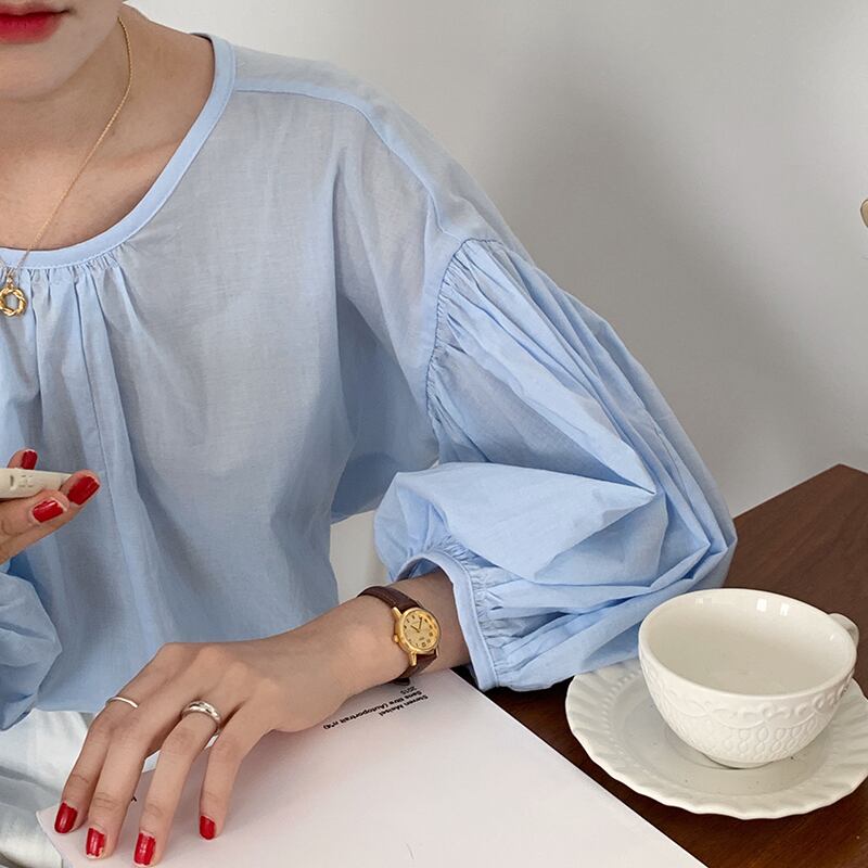 新品 ブルーラウンドネックプリーツスリーブシャツブラウスワイドレッグカジュアルパンツ ランタンスリーブ ⦿韓国 オルチャン K-pop アイドル ジャケット スーツ ワンピース カーディガン ニット フーディー トレーナー キャミソール スカート シャツ ブラウス 5A6318953 | K clothig adult