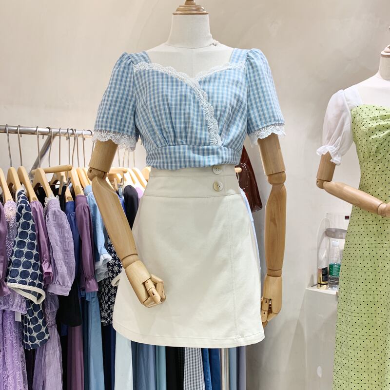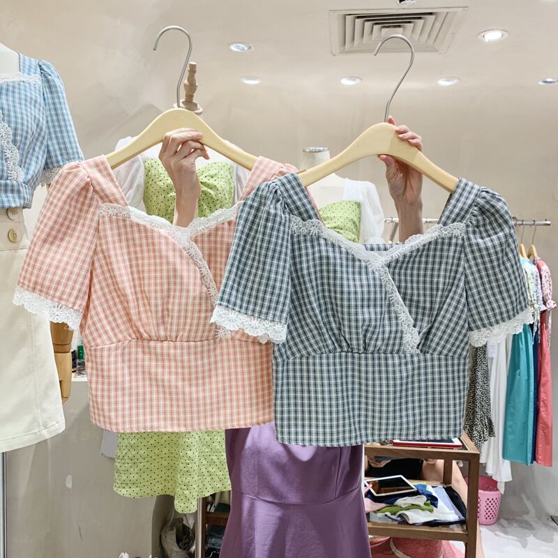 新品 レースショートチェック柄シャツブラウス ステッチ ⦿韓国 オルチャン K-pop アイドル ジャケット スーツ ワンピース カーディガン ニット フーディー トレーナー キャミソール スカート シャツ ブラウス 5B2741746