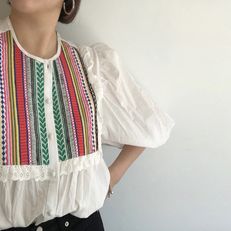 新品 スタンダードエスニック♡ラウンドネックレーススリーブシャツブラウス大人女子☆ レトロ ステッチ ⦿韓国 オルチャン K-pop アイドル ジャケット スーツ ワンピース カーディガン ニット フーディー トレーナー キャミソール スカート シャツ ブラウス 5A1086516