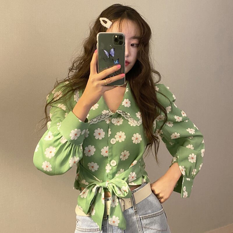 新品 ♡花柄レース★リボンショートシフォンシャツブラウス ステッチ ⦿韓国 オルチャン K-pop アイドル ジャケット スーツ ワンピース カーディガン ニット フーディー トレーナー キャミソール スカート シャツ ブラウス 5A2506222