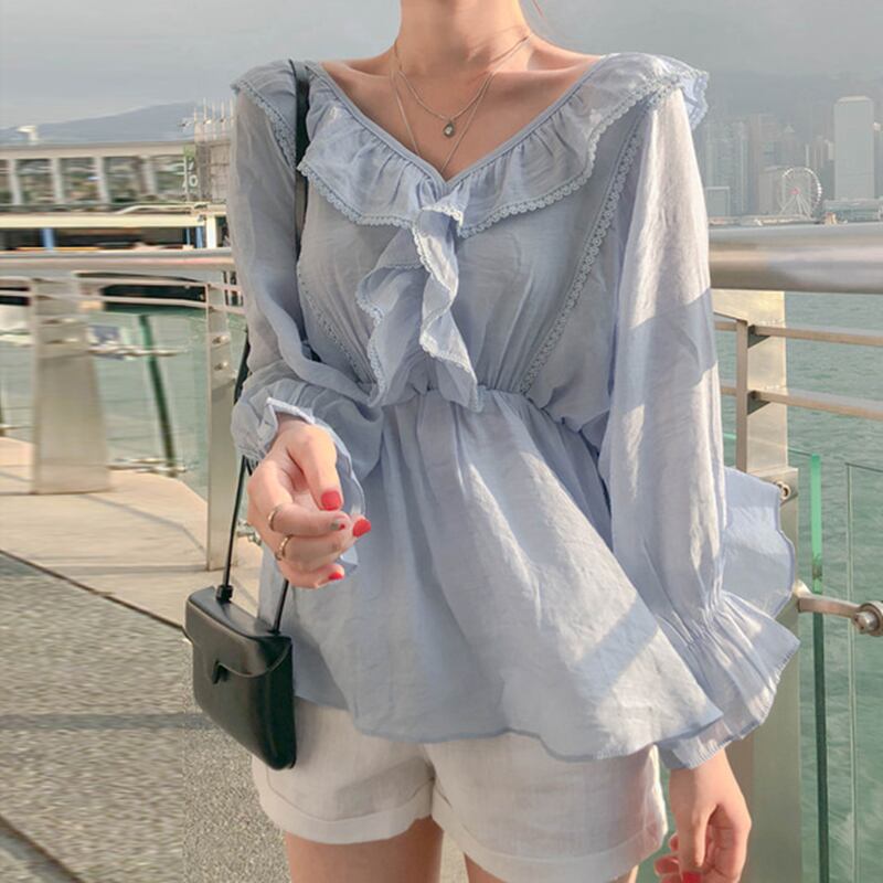 新品 ブルー白Vネックラッフル★♥カワイイ♥スリーブシャツブラウス ホワイト レッド ステッチ ⦿韓国 オルチャン K-pop アイドル ジャケット スーツ ワンピース カーディガン ニット フーディー トレーナー キャミソール スカート シャツ ブラウス 5A2314628