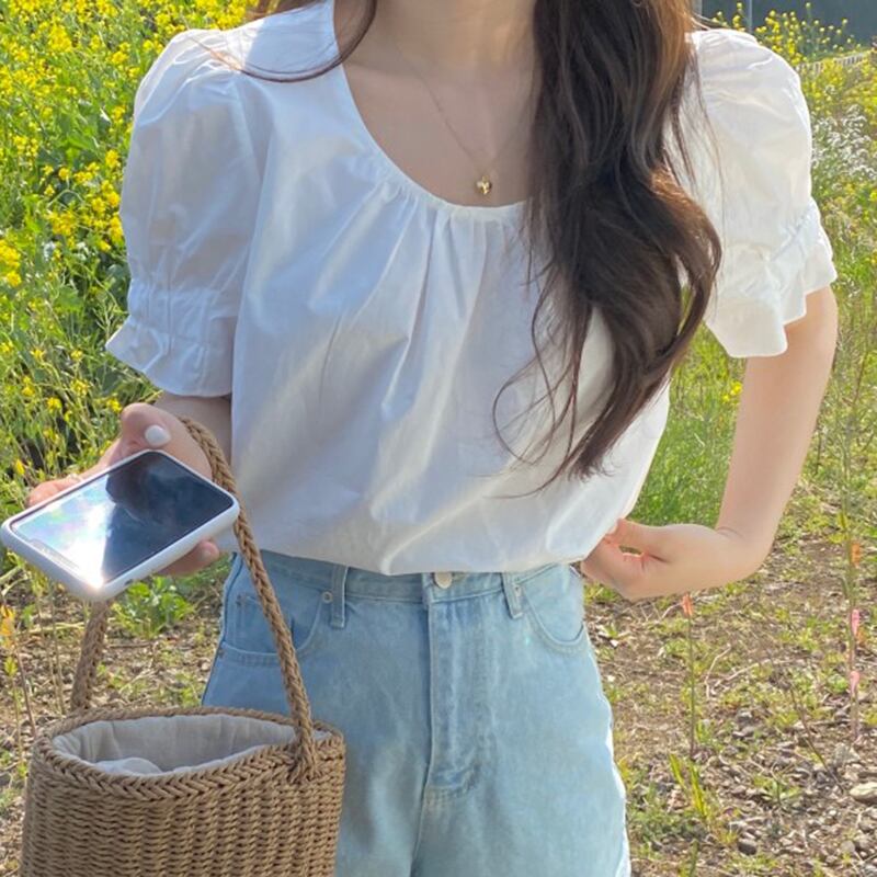 新品 ラウンドネックプリーツスリーブシャツブラウスサイド ⦿韓国 オルチャン K-pop アイドル ジャケット スーツ ワンピース カーディガン ニット フーディー トレーナー キャミソール スカート シャツ ブラウス 5A2401112