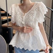 新品 Vネック花柄レース刺繍ジャカードスリーブシャツブラウス大人女子☆ フラワーデザイン ステッチ ⦿韓国 オルチャン K-pop アイドル ジャケット スーツ ワンピース カーディガン ニット フーディー トレーナー キャミソール スカート シャツ ブラウス 5A9996977