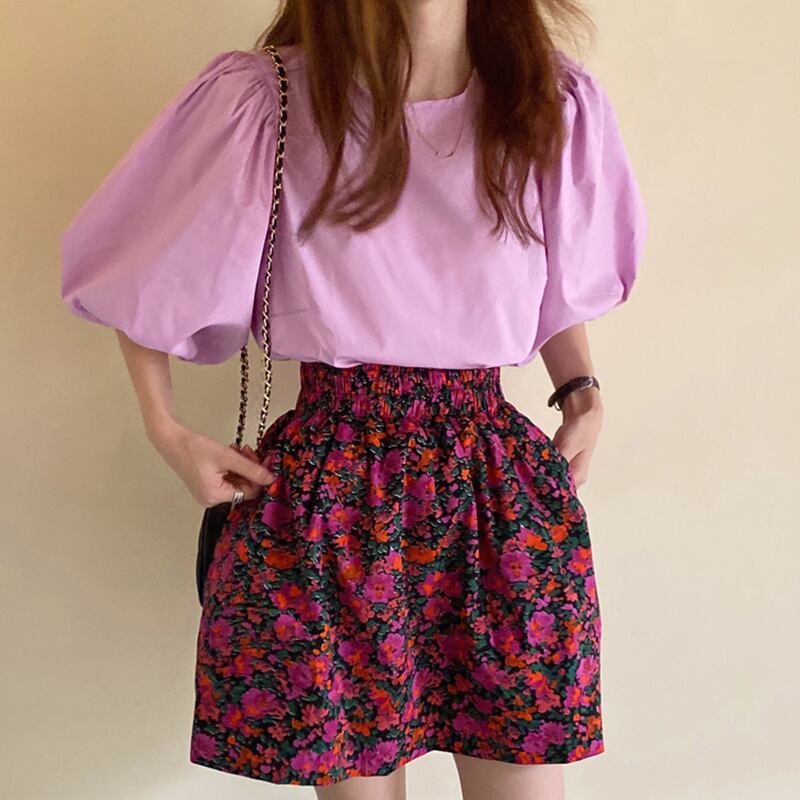 新品 白ラウンドネックスリーブシャツブラウス花柄スカート ホワイト ⦿韓国 オルチャン K-pop アイドル ジャケット スーツ ワンピース カーディガン ニット フーディー トレーナー キャミソール スカート シャツ ブラウス 5A0063991