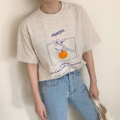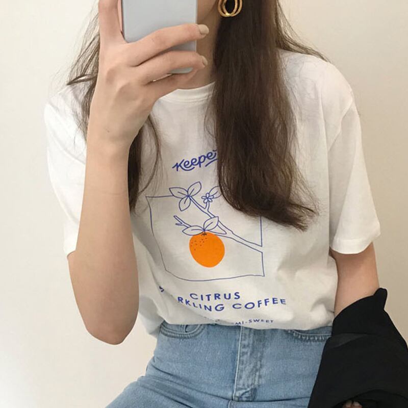 新品 オレンジプリント柄ラウンドネックプルオーバー カジュアルTシャツ トップス 大人女子☆ ⦿韓国 オルチャン K-pop アイドル ジャケット スーツ ワンピース カーディガン ニット フーディー トレーナー キャミソール スカート シャツ ブラウス 5A1635153 | K clothig adult