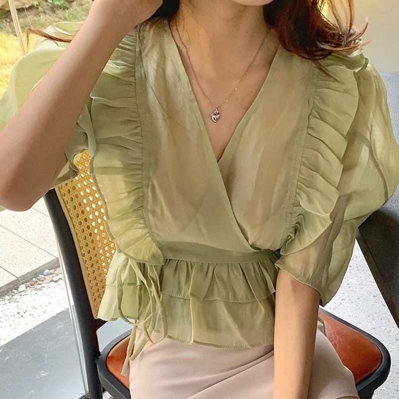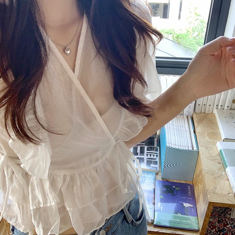 新品 Vネッククロスサイド★スリーブショートシャツブラウストップス ⦿韓国 オルチャン K-pop アイドル ジャケット スーツ ワンピース カーディガン ニット フーディー トレーナー キャミソール スカート シャツ ブラウス 5A9322827