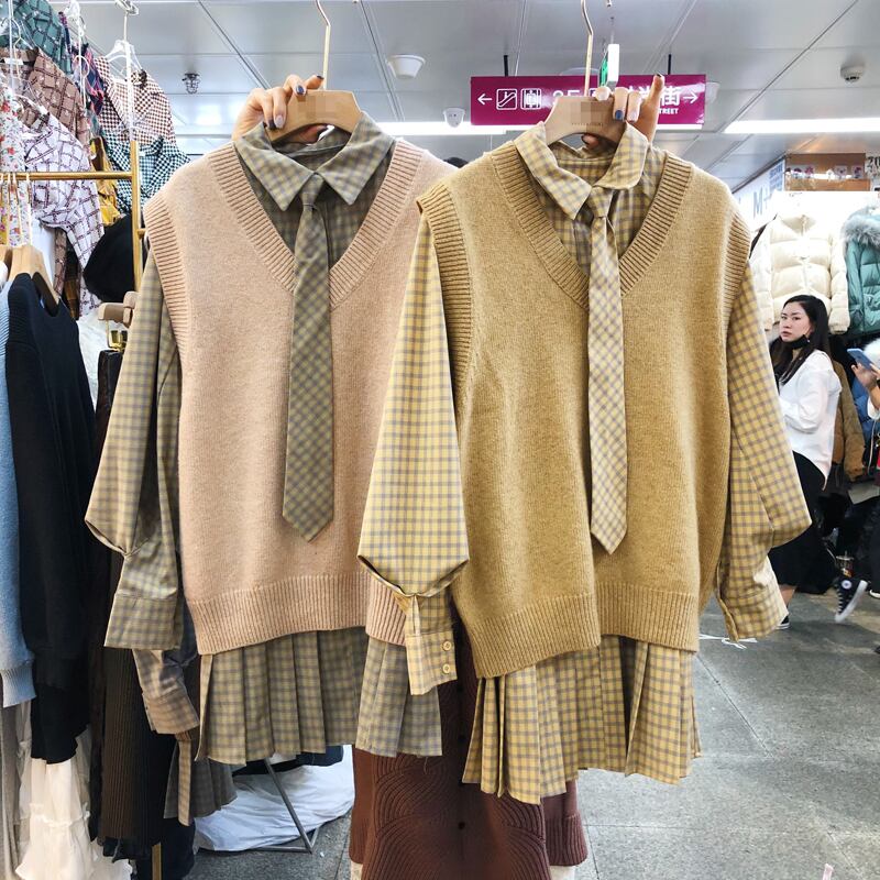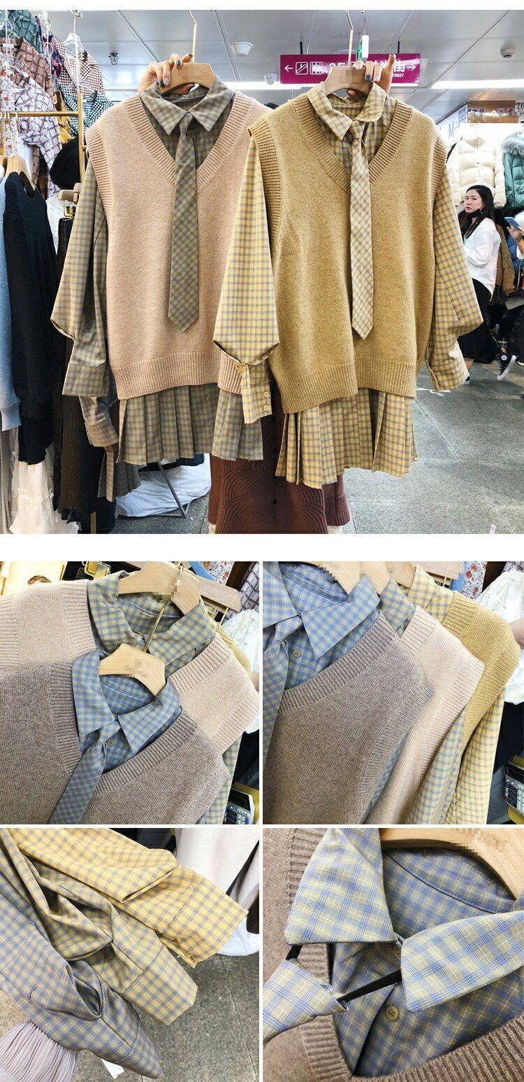 新品 オータムVネックニットチェック柄スリーブシャツブラウスドレス ワンピースセット 秋物 ピュア ⦿韓国 オルチャン K-pop アイドル ジャケット スーツ ワンピース カーディガン ニット フーディー トレーナー キャミソール スカート シャツ ブラウス 5B4693699