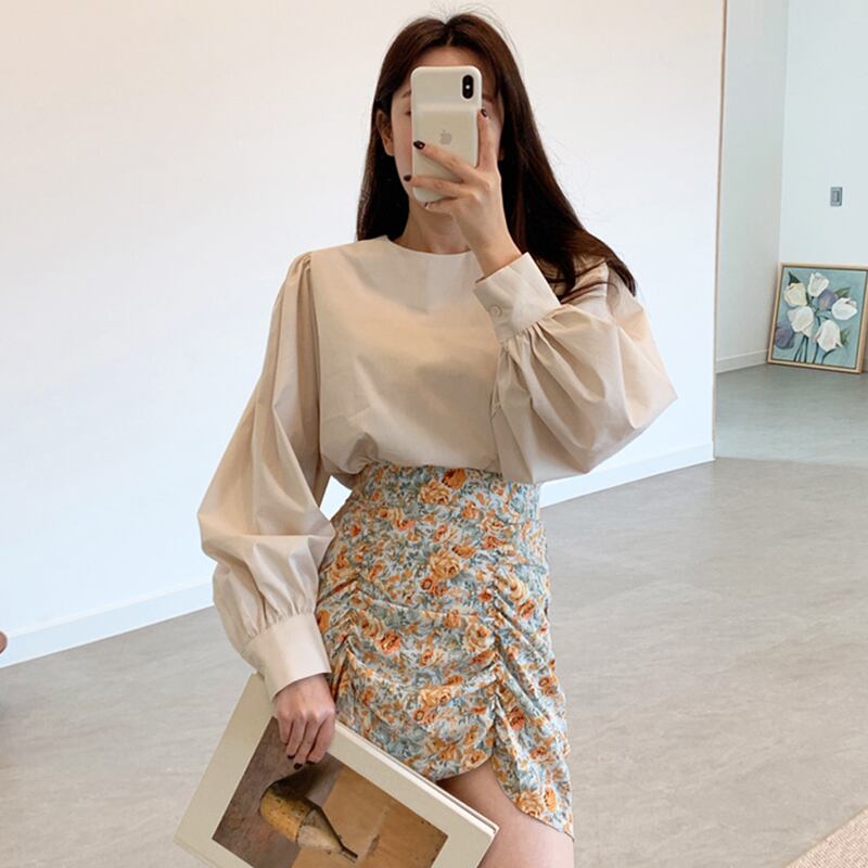 新品 ラウンドネックスリーブシャツブラウスプリーツ今年流行☆花柄スカート ランタンスリーブ スウィート ⦿韓国 オルチャン K-pop アイドル ジャケット スーツ ワンピース カーディガン ニット フーディー トレーナー キャミソール スカート シャツ ブラウス 5A6193595
