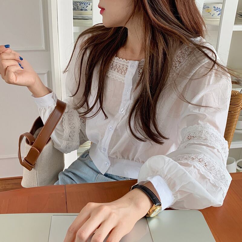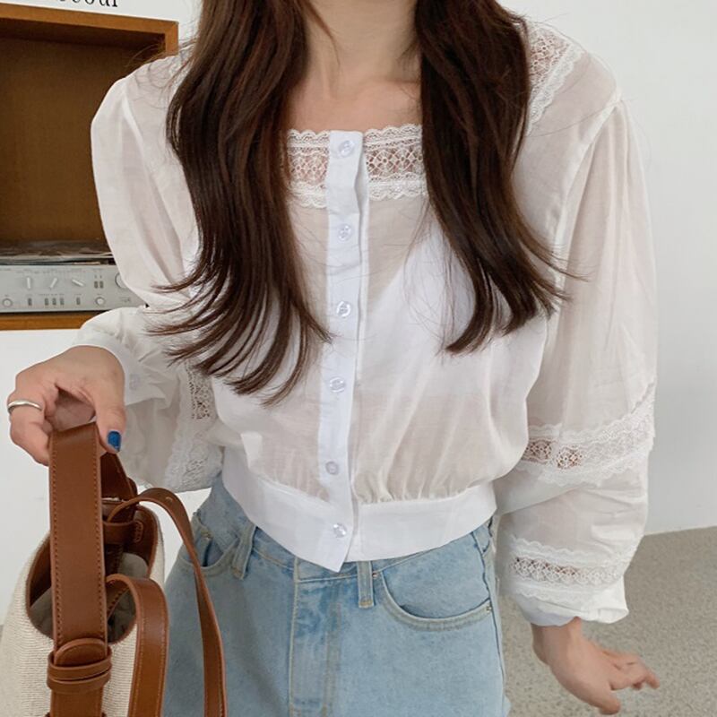 新品 スタンダード♡♥カワイイ♥レーススリーブショートシャツブラウス ランタンスリーブ レトロ スクウェア ステッチ ⦿韓国 オルチャン K-pop アイドル ジャケット スーツ ワンピース カーディガン ニット フーディー トレーナー キャミソール スカート シャツ ブラウス 5A5070803 | K clothig adult
