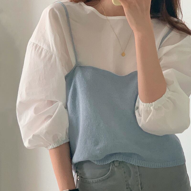 新品 ラウンドネックスリーブシャツブラウスブルーレースニットキャミソール ⦿韓国 オルチャン K-pop アイドル ジャケット スーツ ワンピース カーディガン ニット フーディー トレーナー キャミソール スカート シャツ ブラウス 5A8883484 | K clothig adult